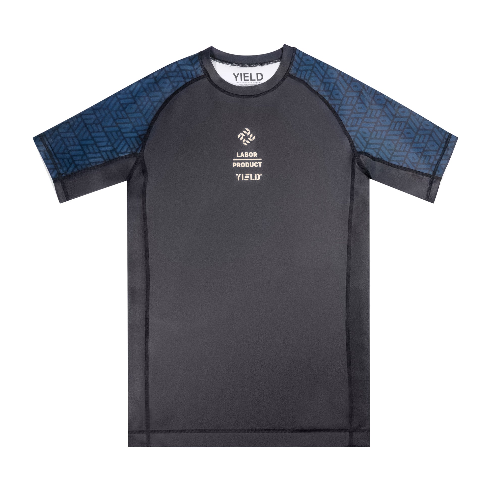 Short sleeve Rashguard for BJJ/MMA. Compression material. Mesh side panel for breathability. 80% polyester, 20% Spandex. Elastic band at waistline to assure no rise up.